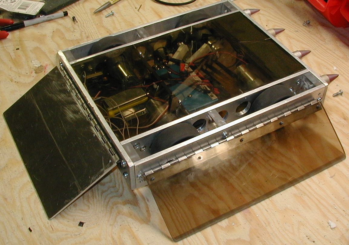 I spent a good amount of time securing the electronics to the frame. I used two internal walls to hold the Vantec and the batteries in there respective places. I bolted the battery eliminator directly to the base plate. I fashioned a receiver box out of very thin steel, and attached it to the base plate. I made sure it was very accessible, because it looked like I'd need to share the receiver between bots.