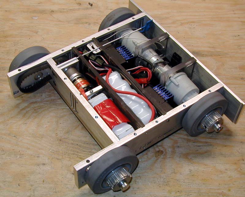 I machined the outer rails out of 3/16" 6061, and bolted everything together. After a bit of initial binding, the wheels turned easily enough in the bronze bushings. The belt tension felt good, so the above mentioned oversized bushing trick saved me from remaking the inner rails. Whew! Here's a short video of the first test drive. 2 Handiworks at 7.2V seemed like a good combination. I can still spin the wheels when pushing against the wall. If I had another 12 pound bot on me, and I was pushing against the wall, I might be in trouble. Here's to hoping I don't need to resort to being a pushy bot! |